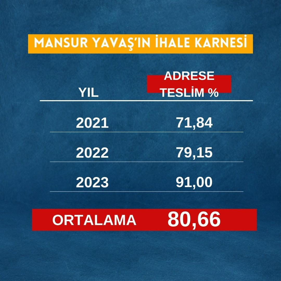 Ankara Büyükşehir Belediyesi 2023 Mali Yılı Denetim Komisyonu verilerine göre: 2023 yılında yapılan 2 bin 210 ihalenin yalnızca 202 tanesi açık ihale olarak yapıldı. Böylece yapılan ihalelerin yüzde 91’i doğrudan temin usulü ile gerçekleştirilmiş oldu. Rakam olarak 2023 yılında 12 Milyar TL üzerinde adrese teslim ihale gerçekleştirildiği tespit edildi. Dürüstlük ve şeffaflık algını oldukça başarılı yöneten Mansur Yavaş’ın, “Yemedi, yedirmedi’ desinler, ‘Çalmadı, çaldırmadı’ desinler bana yeter. Sokağa çıkınca, rahat rahat, başım dik gezmek istiyorum.” sözleri de akıllara geldi.
