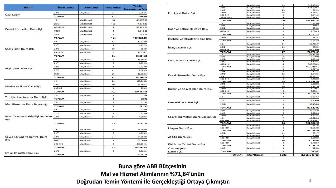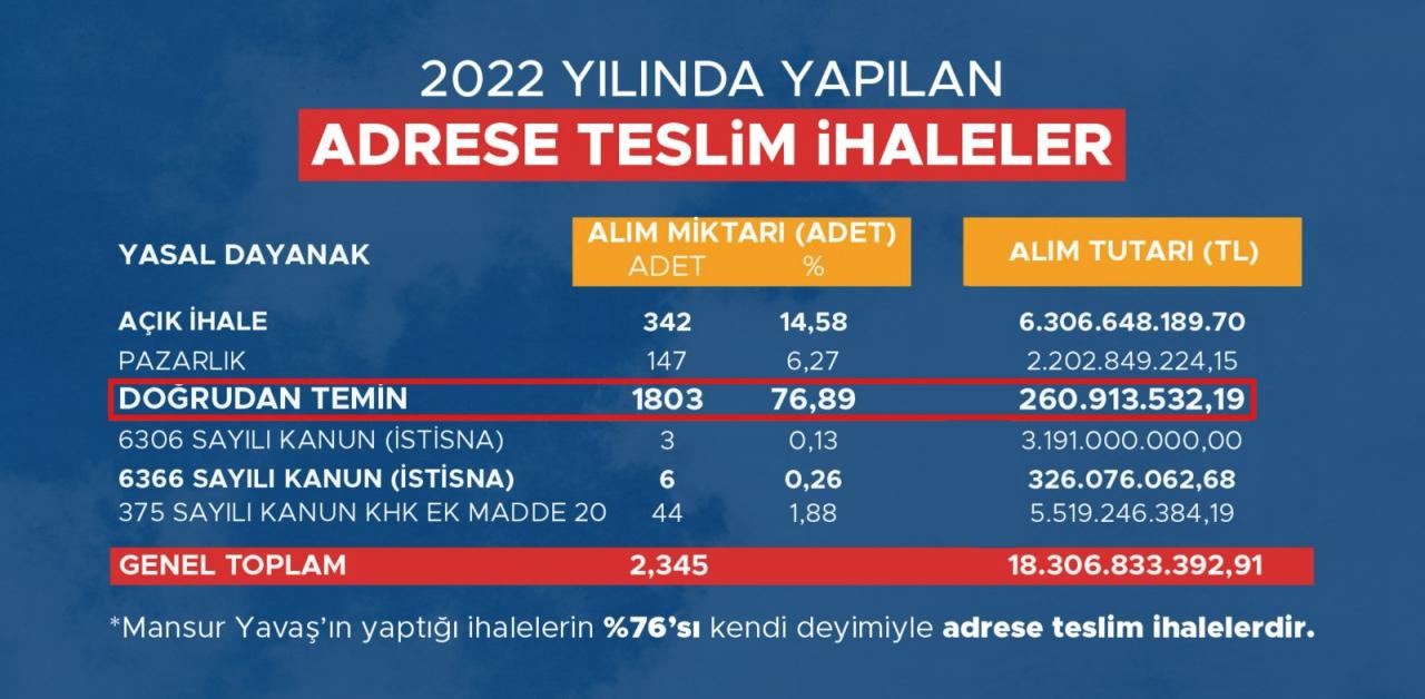 Ankaralılara şeffaf ve hesap verilebilir bir belediyecilik anlayışıyla hizmet ettiğini iddia eden ABB Başkanı Mansur Yavaş’ın, “Benim herhangi bir yakınım, tanıdığım usulsüz olarak ihale alamaz belediyenin önünden dahi geçemez.” sözleri halen tazeliğini korurken, 2021 yılında Mal ve Hizmet Alımlarının yüzde 71,84’ünün de “Doğrudan Temin Yöntemi” ile gerçekleştiği de tespit edildi. 2022 yılında ise Yavaş’ın yaptığı ihalelerin yüzde 76’sı 2022 yılı itibariyle “adrese teslim ihaleler” olarak kayıtlara geçti.