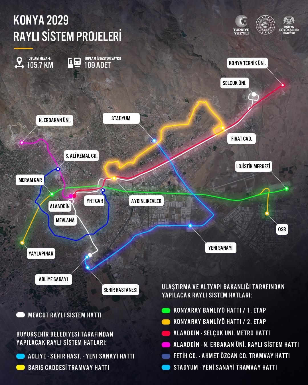 Ulaştırma ve Altyapı Bakanlığıyla birlikte çalışmalara kesintisiz bir şekilde çalışmaya devam ettiklerini anlatan Başkan Altay, “Özellikle Alaaddin-Konya Teknik Üniversitesi hattıyla birlikte Konya’nın ilk metrosunu inşa etmek için yoğun çaba içerisindeyiz. İnşallah en kısa sürede buna da başlayıp bir sözümüzü daha yerine getirmiş olacağız. Bununla birlikte Fetih Caddesi-Ahmet Özcan Caddesi-Çeçenistan Caddesi’nde Meram-Karatay bağlantısını sağlayacak ve yeni YHT Gar’a kadar uzanan yeni raylı sistemle ilgili çalışmalarımızı gerçekleştiriyoruz. Alaaddin-Necmettin Erbakan Üniversitesi hattının da proje çalışmalarına başlamakla ilgili bakanlığımız yazıları yazdı, bununla ilgili çalışmaları yürütüyoruz. Bu süreçte yapımına devam ettiğimiz 17,4 kilometre uzunluğunda KONYARAY Banliyö Hattı’nda da çalışmalar kesintisiz şekilde devam ediyor. İlk etapta Meram Gar’dan başlayan ve Kayacık Lojistik Merkezi’ne kadar ulaşacak hatta artık şehir içi kısmında da çalışmalarına devam ediyoruz. İnşallah 2026 yılında oranın hizmete açılmasıyla ilgili bir çaba içindeyiz” ifadelerini kullandı.