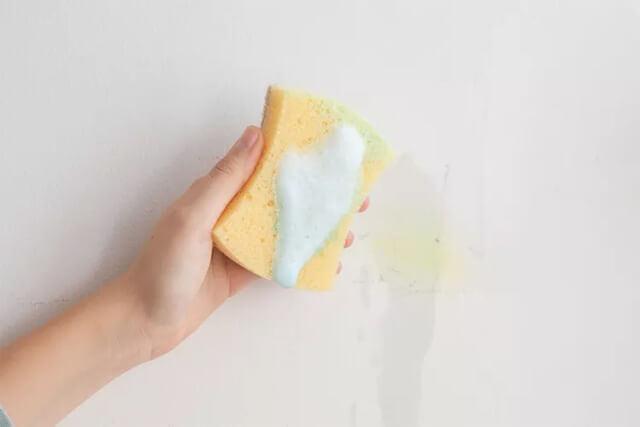 Sihirli sünger ile beyaz duvarları temizlemek için süngeri ıslatın ve leke çıkana kadar duvarı ovalayın.