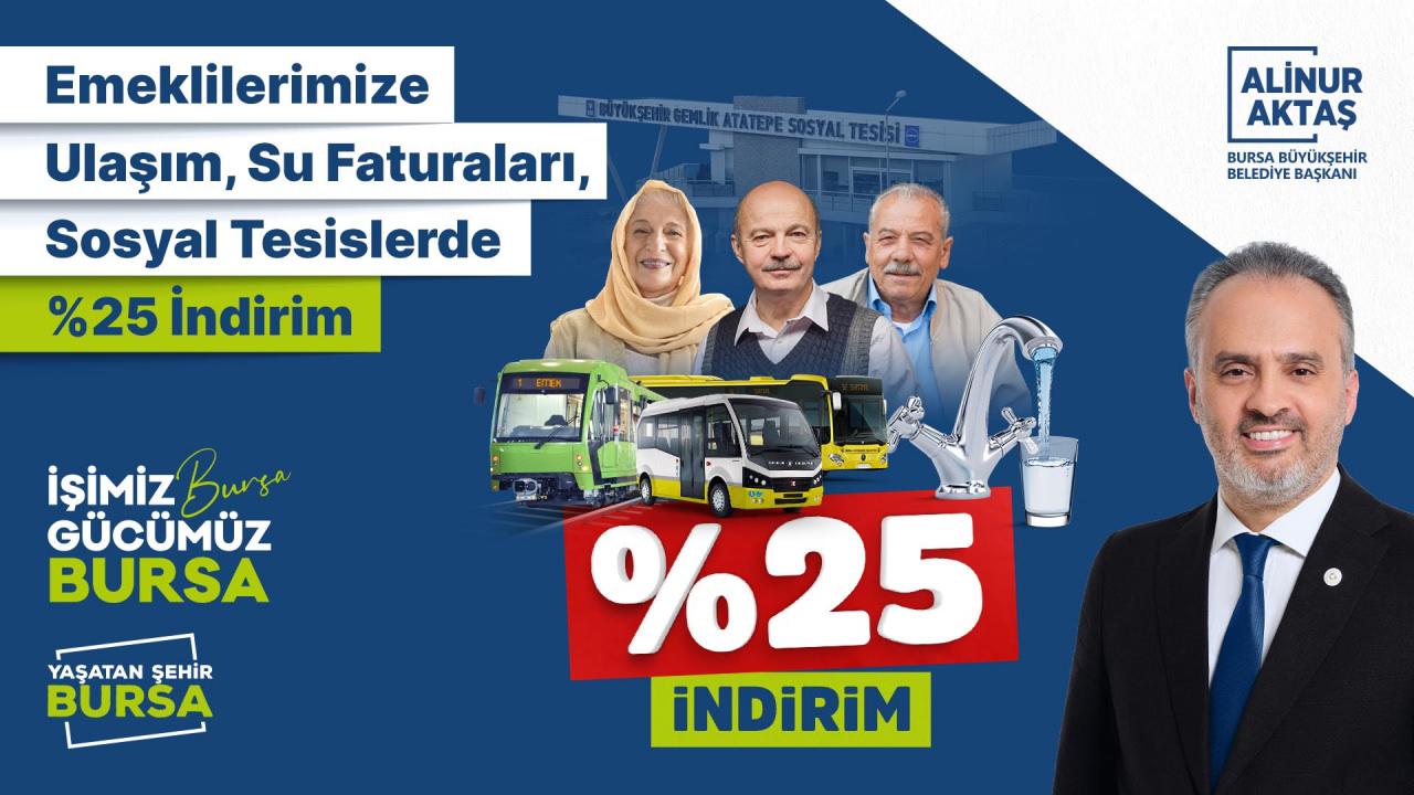 Bursa Büyükşehir Belediye Başkanı Alinur Aktaş, yeni dönemde tüm emeklilere ulaşımda, su faturalarında ve sosyal tesislerde yüzde 25 indirim uygulanacağını belirterek, “Emeklilerimize Ramazan Bayramı ve Kurban Bayramı olmak üzere yılda 2 kez 1.500 TL’lik nakdi destek sunuyoruz. Başvuru sürecini uzattık. Tüm emeklilerimizin bu destekten yararlanmasını istiyoruz” dedi.