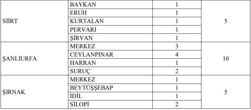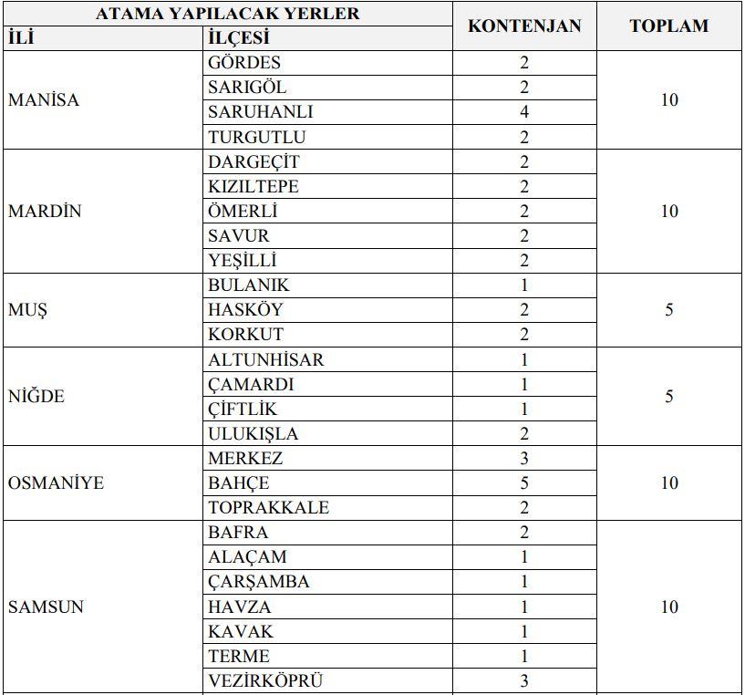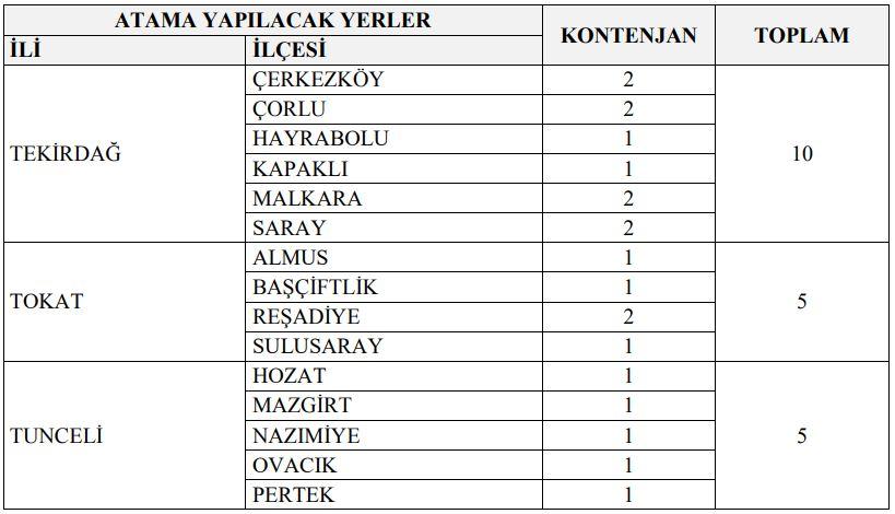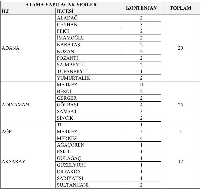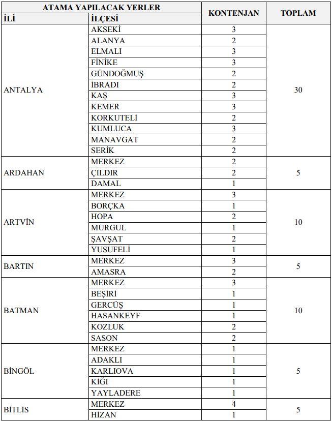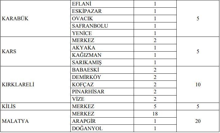 İLLER VE KONTENJAN SAYISI