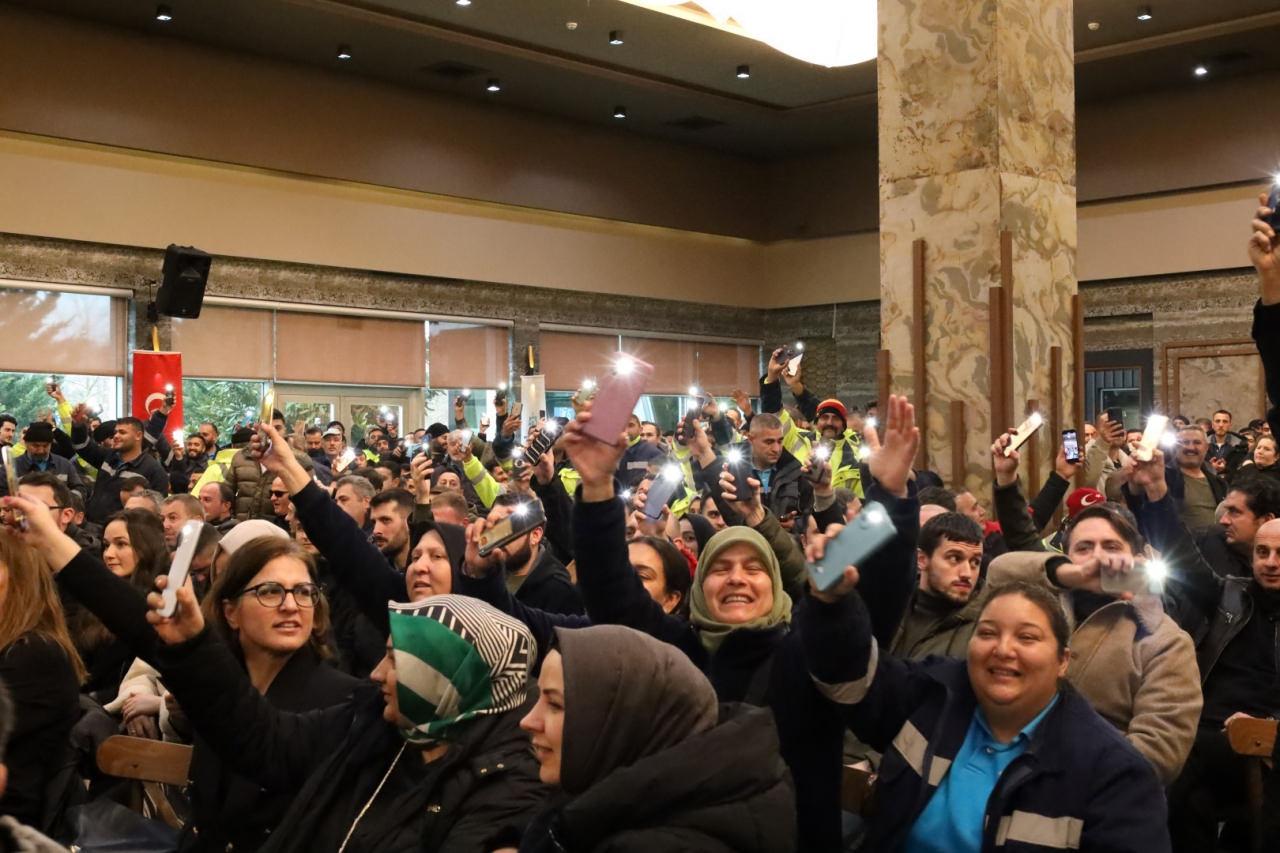 “Peygamberimiz, ‘İşçinin alnın teri kurumadan hakkını verin” diyor diyen Büyükakın, “Sizi ötekiler olarak hiç görmedik. Beraber yürüdüğümüz yol arkadaşlarımız olarak gördük. İmkanlarımızı sonuna kadar zorlayalım dedik. Türkiye’nin en iyi anlaşmalarını yaptık. Yüzü gülen işçi vatandaşa hizmet ederken de onları mutlu eder. Sizi enflasyona ezdirmeyen, elimizdeki imkanların en iyi olacak şekilde düzenleme yaptık. En düşük maaşın 34 bin 40 TL olacak şekilde bir düzenleme yaptık. Personelden gelen artış talebine sonrası bin TL daha artış yaparak en düşük ücreti 35 bin 40 TL yaptık” dedi.
