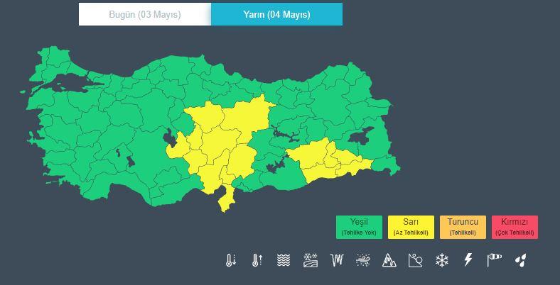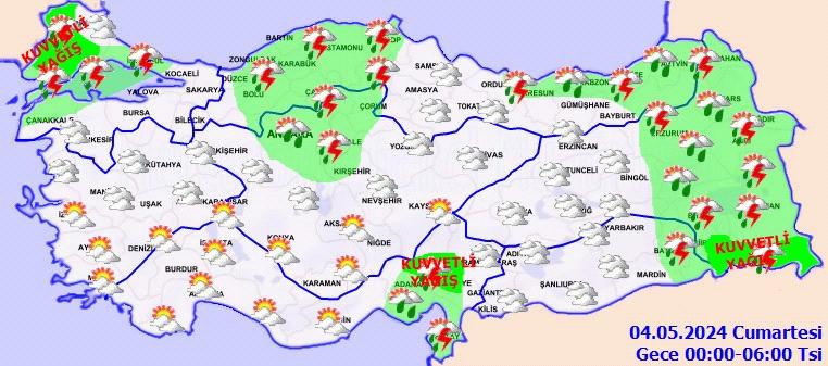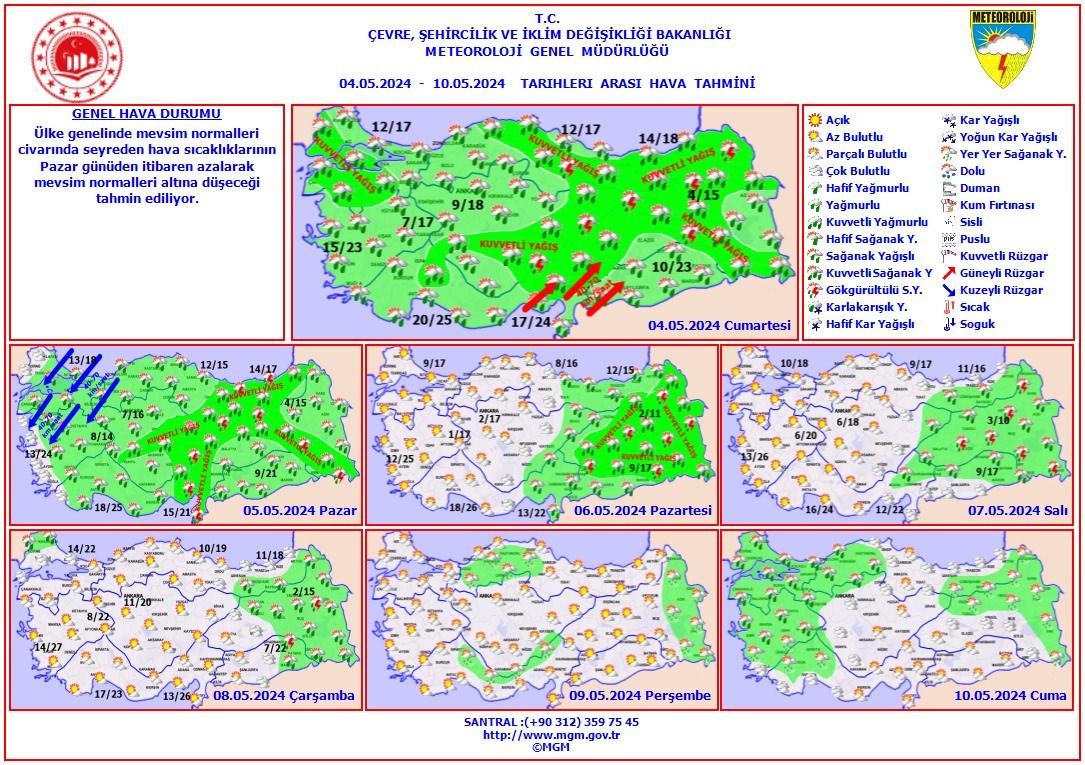 Yağışların; Edirne, Tekirdağ, Çanakkale, Balıkesir, Bursa, Osmaniye, Kahramanmaraş, Niğde, Kayseri, Sivas, Kastamonu, Sinop, Amasya, Tokat, Malatya, Siirt, Şırnak, Hakkari ve Adıyaman çevreleri ile Adana’nın kuzey kesimlerinde yer yer kuvvetli olması beklendiğinden yaşanabilecek sel, su baskını, yıldırım, yerel dolu yağışı, yağış anında kuvvetli rüzgar gibi olumsuzluklara karşı dikkatli ve tedbirli olunması gerekmektedir.
