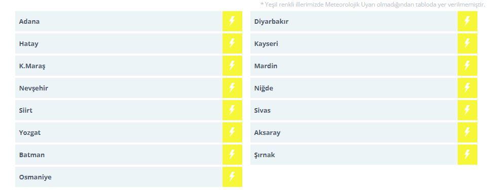 Uyarı yapılan iller şu şekilde: Adana, Edirne, Hakkari, Iğdır, Kırklareli, Osmaniye, Şırnak, Van, Ağrı, Erzurum, Hatay, Kars, Mardin, Siirt, Tekirdağ.