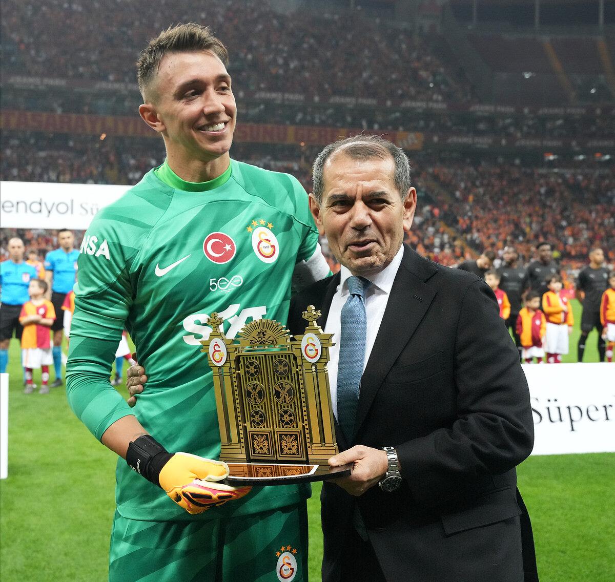 Maç öncesindeki seremonide Galatasaray Kulübü Başkanı Dursun Özbek, günün anısına Uruguaylı kaleciye plaket takdim etti.